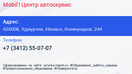 Mobil1 Центр, автосервис по адресу 426008, Удмуртия, Ижевск, Коммунаров, 244 в дальнейшем Организация, размещена в следующих категориях: