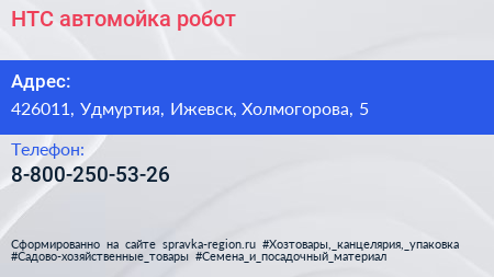 НТС, автомойка-робот по адресу 426011, Удмуртия, Ижевск, Холмогорова, 5 в дальнейшем Организация, размещена в следующих категориях: