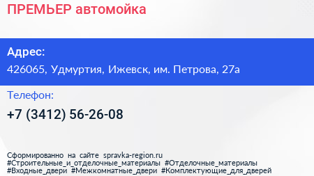 ПРЕМЬЕР, автомойка по адресу 426065, Удмуртия, Ижевск, им. Петрова, 27а в дальнейшем Организация, размещена в следующих категориях: