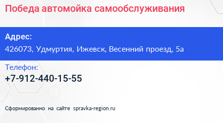 Победа, автомойка самообслуживания по адресу 426073, Удмуртия, Ижевск, Весенний проезд, 5а в дальнейшем Организация, размещена в следующих категориях: