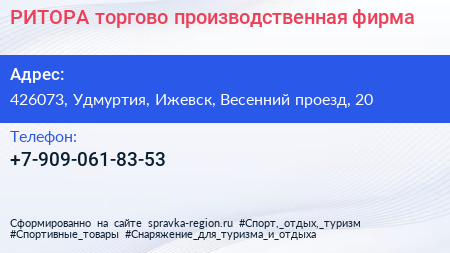 РИТОРА, торгово-производственная фирма по адресу 426073, Удмуртия, Ижевск, Весенний проезд, 20 в дальнейшем Организация, размещена в следующих категориях: