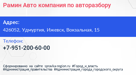 Рамин Авто, компания по авторазбору по адресу 426052, Удмуртия, Ижевск, Вокзальная, 15 в дальнейшем Организация, размещена в следующих категориях: