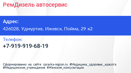 РемДизель, автосервис по адресу 426028, Удмуртия, Ижевск, Пойма, 29 к2 в дальнейшем Организация, размещена в следующих категориях: