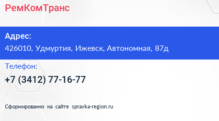 РемКомТранс по адресу 426010, Удмуртия, Ижевск, Автономная, 87д в дальнейшем Организация, размещена в следующих категориях: