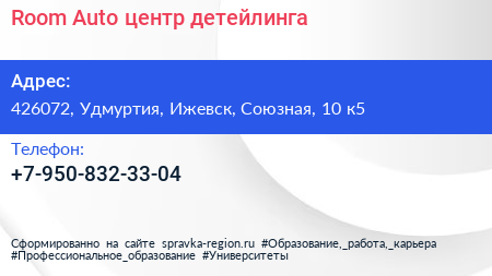 Room Auto, центр детейлинга по адресу 426072, Удмуртия, Ижевск, Союзная, 10 к5 в дальнейшем Организация, размещена в следующих категориях: