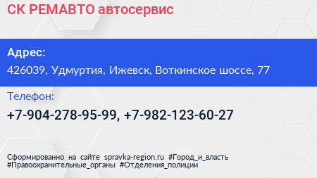 СК-РЕМАВТО, автосервис по адресу 426039, Удмуртия, Ижевск, Воткинское шоссе, 77 в дальнейшем Организация, размещена в следующих категориях: