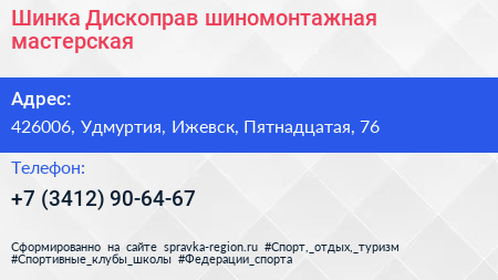 Шинка Дископрав, шиномонтажная мастерская по адресу 426006, Удмуртия, Ижевск, Пятнадцатая, 76 в дальнейшем Организация, размещена в следующих категориях:
