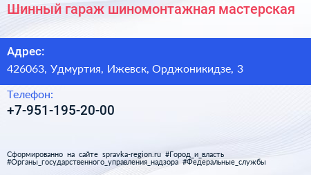 Шинный гараж, шиномонтажная мастерская по адресу 426063, Удмуртия, Ижевск, Орджоникидзе, 3 в дальнейшем Организация, размещена в следующих категориях: