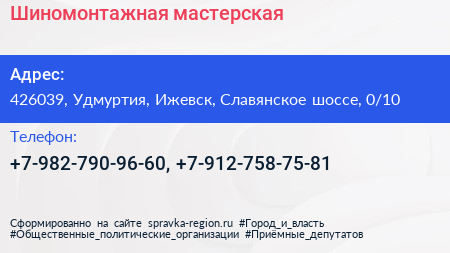 Шиномонтажная мастерская по адресу 426039, Удмуртия, Ижевск, Славянское шоссе, 0/10 в дальнейшем Организация, размещена в следующих категориях: