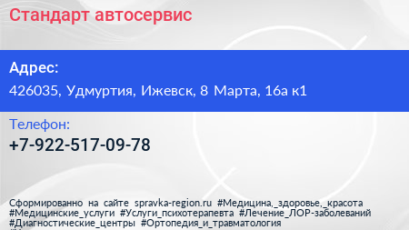 Стандарт, автосервис по адресу 426035, Удмуртия, Ижевск, 8 Марта, 16а к1 в дальнейшем Организация, размещена в следующих категориях: