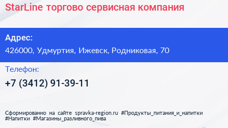 StarLine, торгово-сервисная компания по адресу 426000, Удмуртия, Ижевск, Родниковая, 70 в дальнейшем Организация, размещена в следующих категориях: