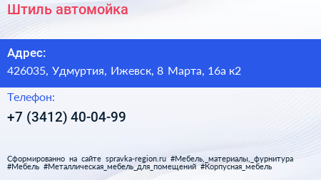 Штиль, автомойка по адресу 426035, Удмуртия, Ижевск, 8 Марта, 16а к2 в дальнейшем Организация, размещена в следующих категориях:
