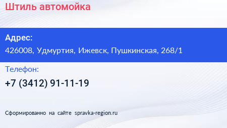 Штиль, автомойка по адресу 426008, Удмуртия, Ижевск, Пушкинская, 268/1 в дальнейшем Организация, размещена в следующих категориях: