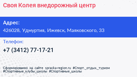 Своя Колея, внедорожный центр по адресу 426028, Удмуртия, Ижевск, Маяковского, 33 в дальнейшем Организация, размещена в следующих категориях:
