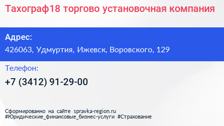 Тахограф18, торгово-установочная компания по адресу 426063, Удмуртия, Ижевск, Воровского, 129 в дальнейшем Организация, размещена в следующих категориях: