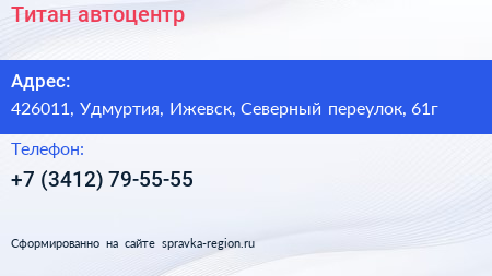 Титан, автоцентр по адресу 426011, Удмуртия, Ижевск, Северный переулок, 61г в дальнейшем Организация, размещена в следующих категориях: