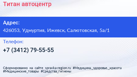Титан, автоцентр по адресу 426053, Удмуртия, Ижевск, Салютовская, 5а/1 в дальнейшем Организация, размещена в следующих категориях: