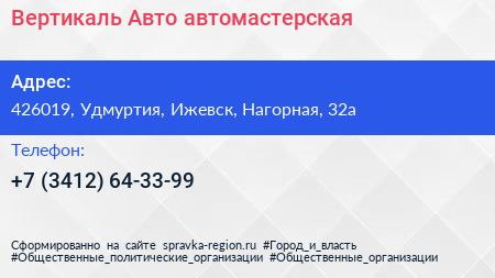 Вертикаль Авто, автомастерская по адресу 426019, Удмуртия, Ижевск, Нагорная, 32а в дальнейшем Организация, размещена в следующих категориях: