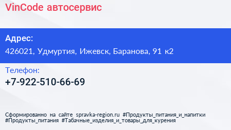 VinCode, автосервис по адресу 426021, Удмуртия, Ижевск, Баранова, 91 к2 в дальнейшем Организация, размещена в следующих категориях:
