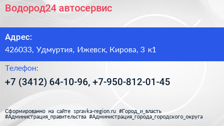 Водород24, автосервис по адресу 426033, Удмуртия, Ижевск, Кирова, 3 к1 в дальнейшем Организация, размещена в следующих категориях: