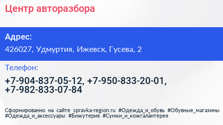 Центр авторазбора по адресу 426027, Удмуртия, Ижевск, Гусева, 2 в дальнейшем Организация, размещена в следующих категориях:
