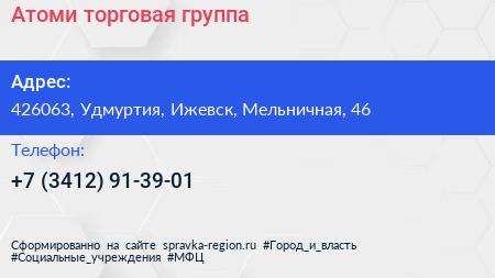Атоми, торговая группа по адресу 426063, Удмуртия, Ижевск, Мельничная, 46 в дальнейшем Организация, размещена в следующих категориях: