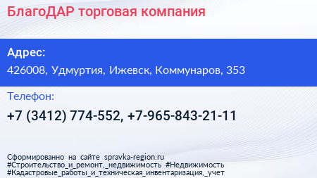 БлагоДАР, торговая компания по адресу 426008, Удмуртия, Ижевск, Коммунаров, 353 в дальнейшем Организация, размещена в следующих категориях: