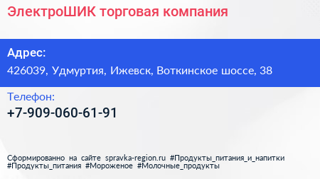 ЭлектроШИК, торговая компания по адресу 426039, Удмуртия, Ижевск, Воткинское шоссе, 38 в дальнейшем Организация, размещена в следующих категориях: