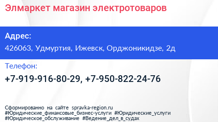 Элмаркет, магазин электротоваров по адресу 426063, Удмуртия, Ижевск, Орджоникидзе, 2д в дальнейшем Организация, размещена в следующих категориях: