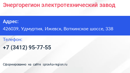Энергорегион, электротехнический завод по адресу 426039, Удмуртия, Ижевск, Воткинское шоссе, 338 в дальнейшем Организация, размещена в следующих категориях: