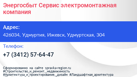 Энергосбыт Сервис, электромонтажная компания по адресу 426034, Удмуртия, Ижевск, Удмуртская, 304 в дальнейшем Организация, размещена в следующих категориях:
