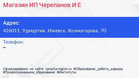 Магазин, ИП Черепанов И.Е. по адресу 426011, Удмуртия, Ижевск, Холмогорова, 70 в дальнейшем Организация, размещена в следующих категориях:
