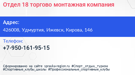 Отдел 18, торгово-монтажная компания по адресу 426008, Удмуртия, Ижевск, Кирова, 146 в дальнейшем Организация, размещена в следующих категориях:
