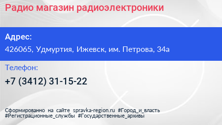 Радио, магазин радиоэлектроники по адресу 426065, Удмуртия, Ижевск, им. Петрова, 34а в дальнейшем Организация, размещена в следующих категориях: