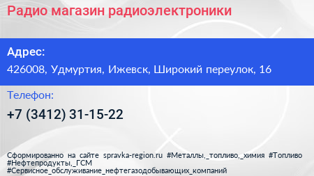 Радио, магазин радиоэлектроники по адресу 426008, Удмуртия, Ижевск, Широкий переулок, 16 в дальнейшем Организация, размещена в следующих категориях: