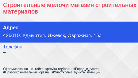 Строительные мелочи, магазин строительных материалов по адресу 426010, Удмуртия, Ижевск, Овражная, 15а в дальнейшем Организация, размещена в следующих категориях: