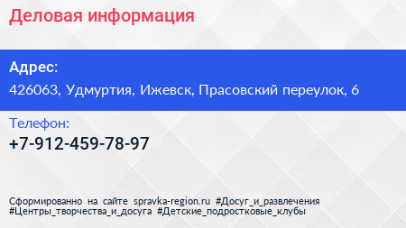 Деловая информация по адресу 426063, Удмуртия, Ижевск, Прасовский переулок, 6 в дальнейшем Организация, размещена в следующих категориях:
