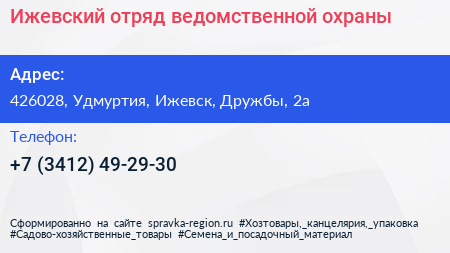 Ижевский отряд ведомственной охраны по адресу 426028, Удмуртия, Ижевск, Дружбы, 2а в дальнейшем Организация, размещена в следующих категориях: