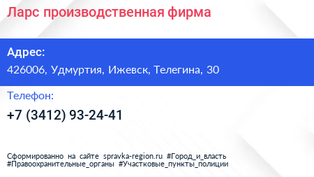 Ларс, производственная фирма по адресу 426006, Удмуртия, Ижевск, Телегина, 30 в дальнейшем Организация, размещена в следующих категориях: