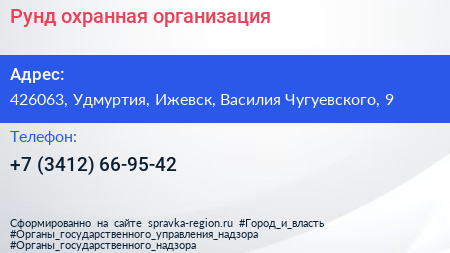 Рунд, охранная организация по адресу 426063, Удмуртия, Ижевск, Василия Чугуевского, 9 в дальнейшем Организация, размещена в следующих категориях: