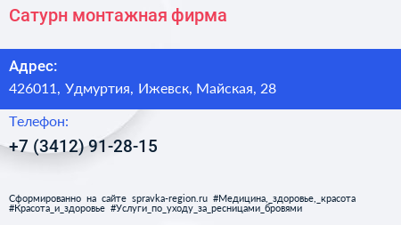 Сатурн, монтажная фирма по адресу 426011, Удмуртия, Ижевск, Майская, 28 в дальнейшем Организация, размещена в следующих категориях: