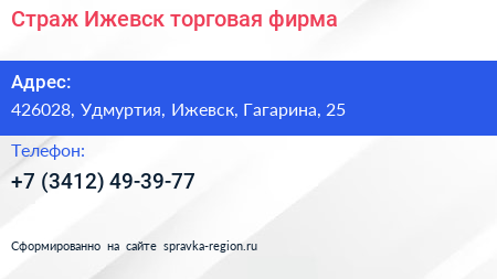 Страж-Ижевск, торговая фирма по адресу 426028, Удмуртия, Ижевск, Гагарина, 25 в дальнейшем Организация, размещена в следующих категориях: