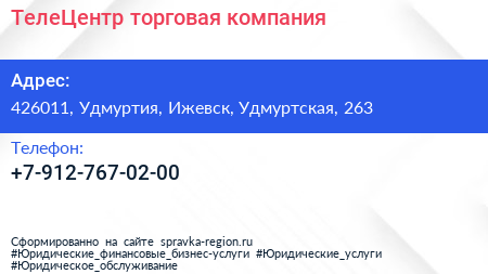 ТелеЦентр, торговая компания по адресу 426011, Удмуртия, Ижевск, Удмуртская, 263 в дальнейшем Организация, размещена в следующих категориях: