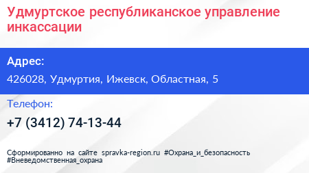 Удмуртское республиканское управление инкассации по адресу 426028, Удмуртия, Ижевск, Областная, 5 в дальнейшем Организация, размещена в следующих категориях:
