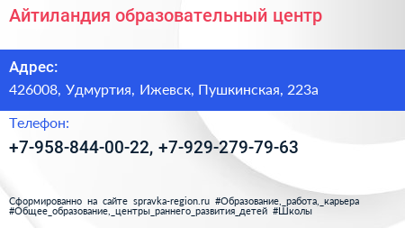 Айтиландия, образовательный центр по адресу 426008, Удмуртия, Ижевск, Пушкинская, 223а в дальнейшем Организация, размещена в следующих категориях: