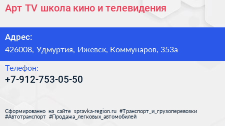 Арт TV, школа кино и телевидения по адресу 426008, Удмуртия, Ижевск, Коммунаров, 353а в дальнейшем Организация, размещена в следующих категориях: