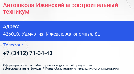 Автошкола, Ижевский агростроительный техникум по адресу 426010, Удмуртия, Ижевск, Автономная, 81 в дальнейшем Организация, размещена в следующих категориях:
