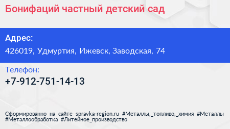 Бонифаций, частный детский сад по адресу 426019, Удмуртия, Ижевск, Заводская, 74 в дальнейшем Организация, размещена в следующих категориях: