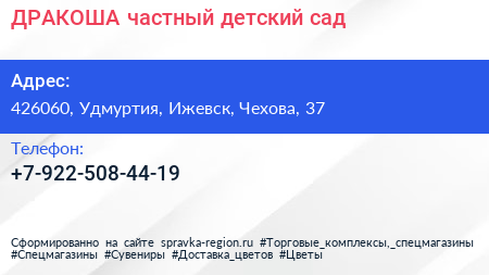 ДРАКОША, частный детский сад по адресу 426060, Удмуртия, Ижевск, Чехова, 37 в дальнейшем Организация, размещена в следующих категориях: