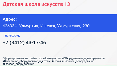 Детская школа искусств №13 по адресу 426034, Удмуртия, Ижевск, Удмуртская, 230 в дальнейшем Организация, размещена в следующих категориях: